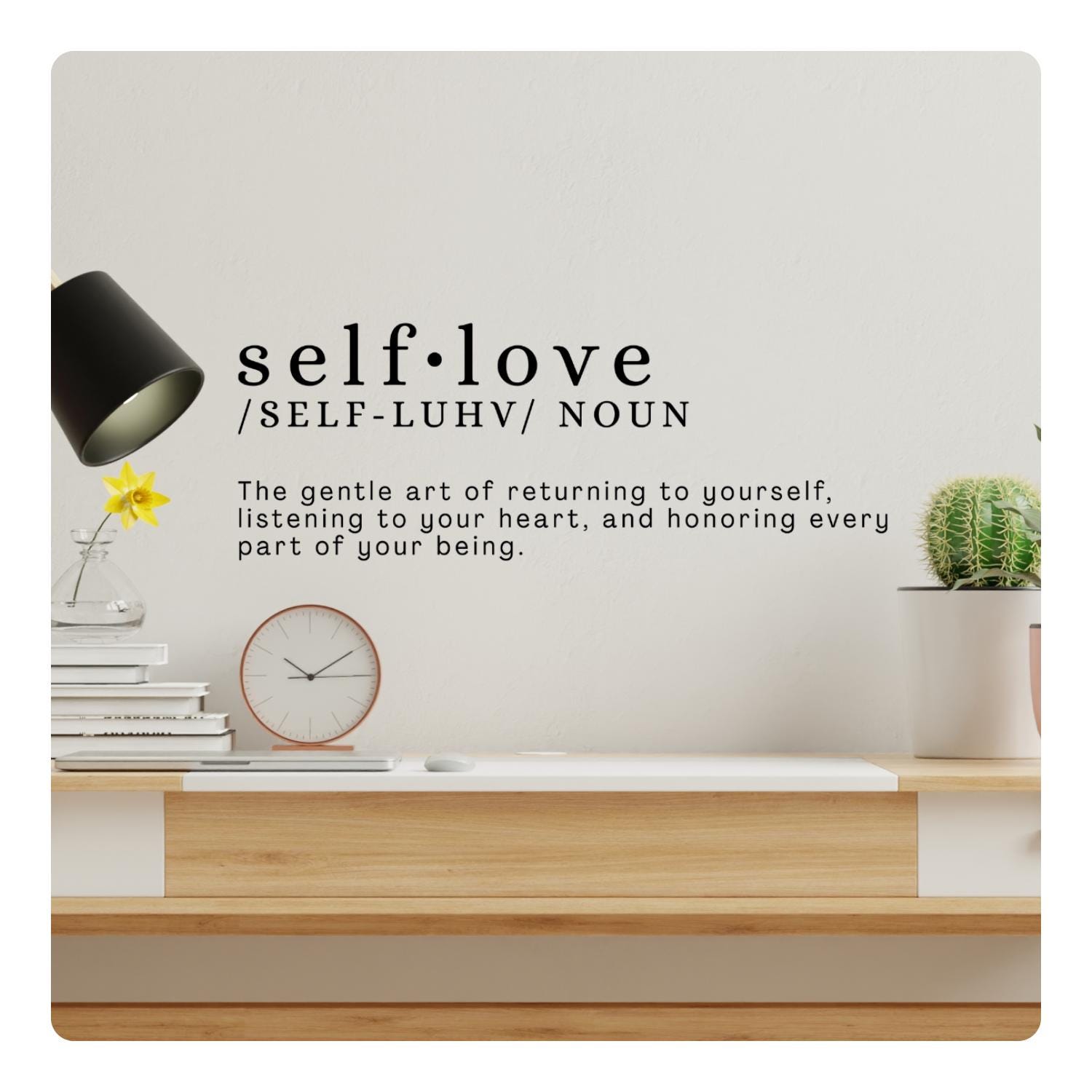 > Motivational wall decal with a self-love quote to inspire peace, mindfulness, and confidence. Removable and perfect for bedrooms, offices, and gyms.